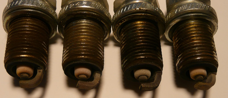 An der Kerze des dritten Zylinder (hergeleitet aus der Reihenfolge, nach der die Kerzen auf dem Foto liegen) ist die Masseelektrode etwas dunkler.