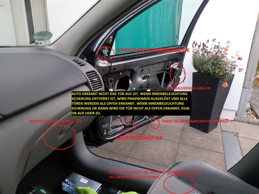 Das Problem: Das Auto erkennt nicht wenn die Beifahrertür auf ist. Im Auto gibts ein Display was alle offenen Türen anzeigt. Dies funktioniert für alle Türen außer bei der Beifahrertür. Die Türbeleuchtung in der Beifahrertür geht ebenfalls nicht an, obwohl die Birne zu 100% OK ist. Lautsprecher funktioniert. Zentralverriegelung funktioniert. Elektrischer Seitenspiegel lässt sich bewegen / kontrollieren. Elektrische Fensterheber funktionieren von Beifahrer und Fahrerseite ohne Probleme. Nur die Tür sowie die Türbeleuchtung funktioniert nicht. Egal ob auf oder zu, das Auto erkennt einfach nicht dass die Beifahrertür geöffnet ist. Zusätzlich zu diesem möglichen "Sensorproblem" in dem Beifahrer Bereich kommt: