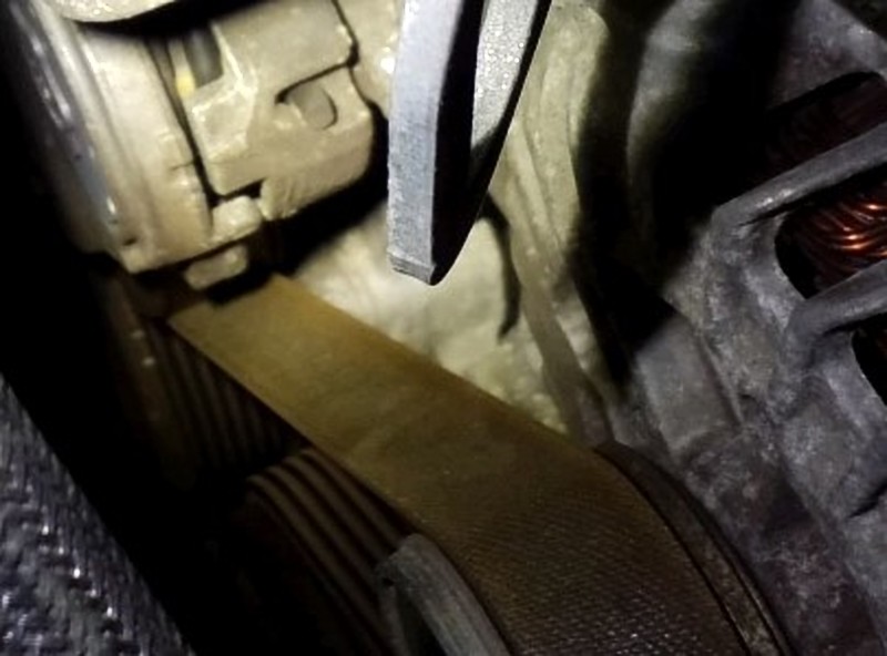 Und noch eine Erkenntnis: dieser Pfeil auf der Spannrolle ist jetzt exakt auf Höhe der Markierung... also scheint das wirklich ein Indiz zu sein, daß sich der Riemen zu sehr gelängt hat.