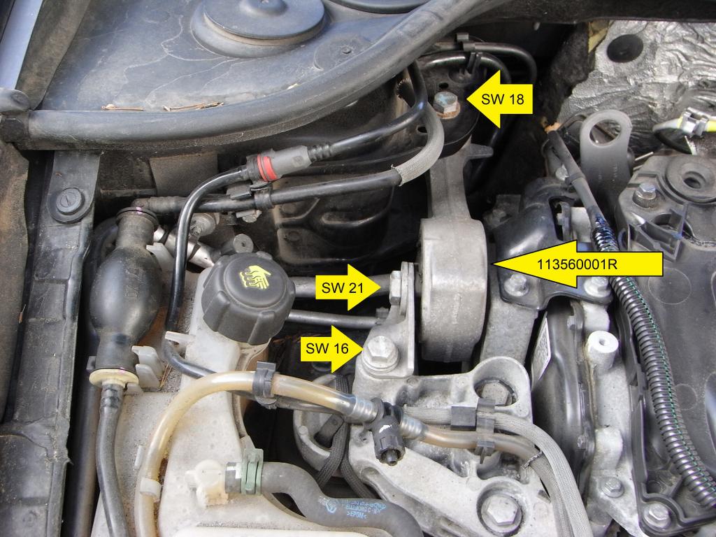 Diese sog. Drehmomentstütze, wie sie hier auch bezeichnet wird, kann man alleine in 10min wechseln mit passendem Werkzeug (16er, 18er und 21er Nuss, meine ich). Das habe ich letzte Woche erst selbst gemacht, diese Stütze ist an der Karosserie, dem Motor und dem großen Hydrolager befestigt, was man auf deinem Bild links sieht.