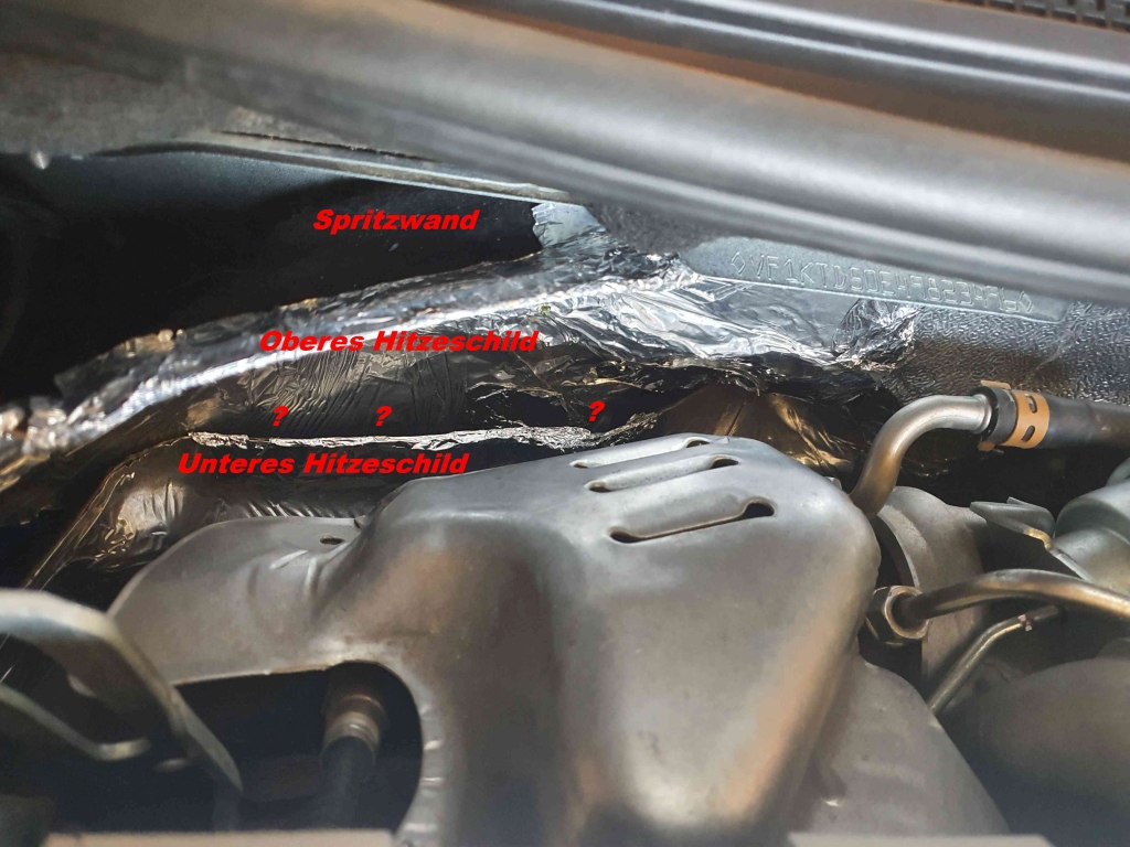 Bei mir ist dieses (lt. Freundlichem nicht mehr lieferbare) Hitzeschild an der Spritzwand/Beifahrerseite marode und war vom Vorbesitzer mal unsachgemäß