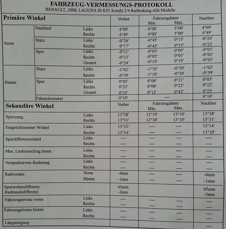 Diese habe ich heute bei Renault durchführen lassen. Soweit alles in Ordnung - Lenkrad steht wieder gerade. Werte wurden auf einem Protokoll vermerkt.