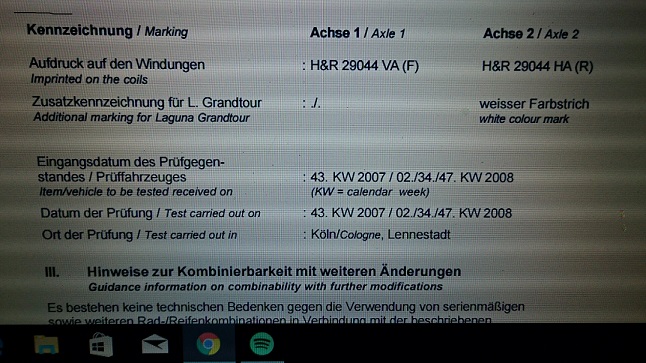 ich fahre einen Laguna 3 Grandtour 2.0 dCi Bj. 2011 ohne 4 Control. Da ich auf dem Auto 19 Zoll mit 235 / 35 / 19 fahre war der Abstand Reifen / Radlauf viel zu groß. Daher habe ich den Wagen tiefer gelegt. Dazu habe ich mir neue Kayaba Dämpfer und die H&R Federn mit 35 mm Tieferlegung eingebaut.