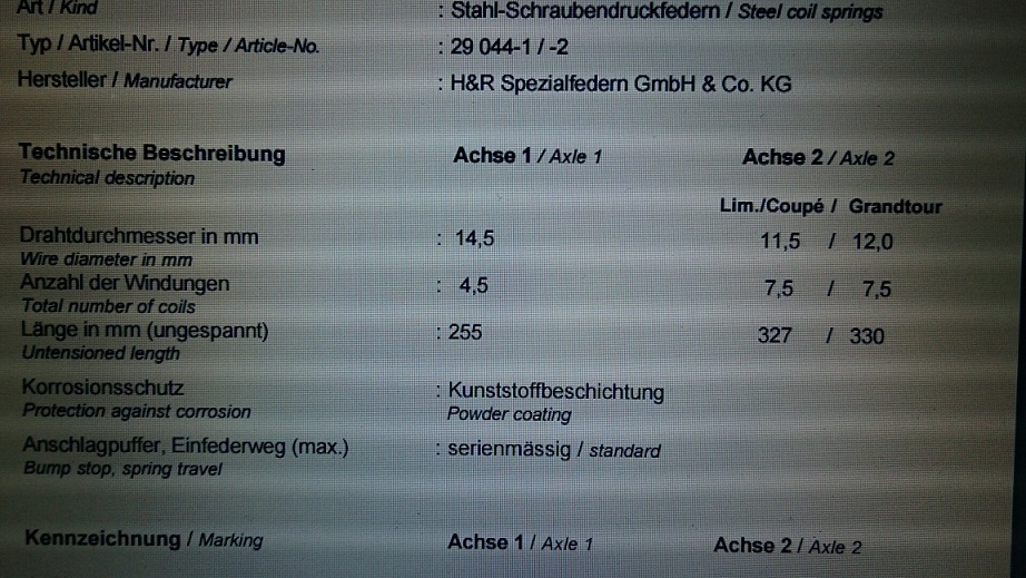 Meine Vermutung ist, dass mir die Federn für hinten vom Coupe/Limo geschickt wurden. Laut Gutachten sind die Federn für den Grandtour um 3mm länger, haben also mehr Vorspannung. Auf den Federn ist die Bezeichnung, ein Kreis und ein paar Daten aufgedruckt. Im Gutachten steht aber, dass die Federn für den Kombi mit einem "weißen Strich" gekennzeichnet sind.