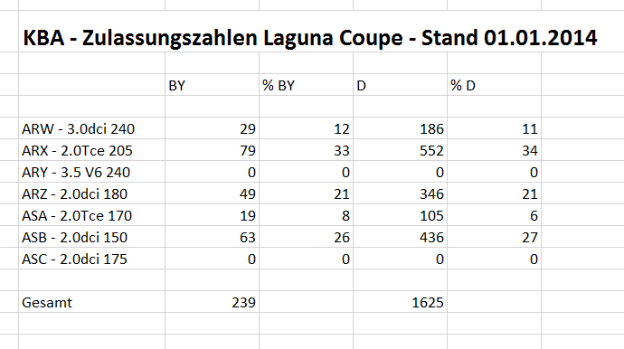 Was ich allerdings nicht verstehe ist, dass zum 01.01.2014 kein einziger 3.5 V6 Benziner angemeldet war und ebenfalls kein einziger dci175, der ja schon 06/2013 auf den Markt kam..