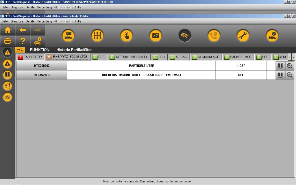 Habe jetzt ein Clip Can angeschlossen und die Fehler ausgelesen. Es sind zwei Fehler vorhanden DTC200262 Partikelfilter und DTC1525F3 Übereinstimmung Multiplex-Signal Tempomat (BIld2).