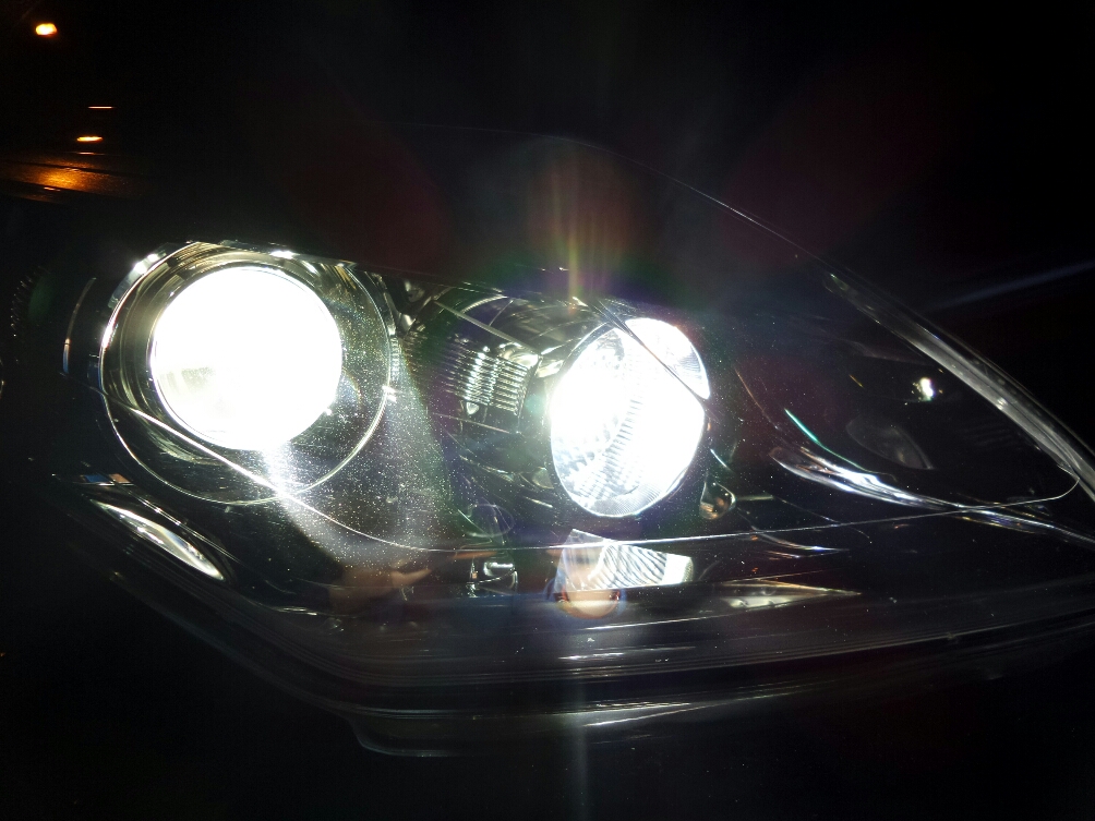 Aufgrund eines lustigen "Bugs" in der Logik der Bordelektrik (davon gehe ich einfach mal aus, wenn man das TFL + Abblendlicht anschalten kann) konnte ich direkt das Xenon mit dem TFL fotografieren. Hier kann man schön die Leuchtkraft der LEDs im direkten Vergleich mit den Xenonlampen vergleichen (auch die Lichtfarbe!).