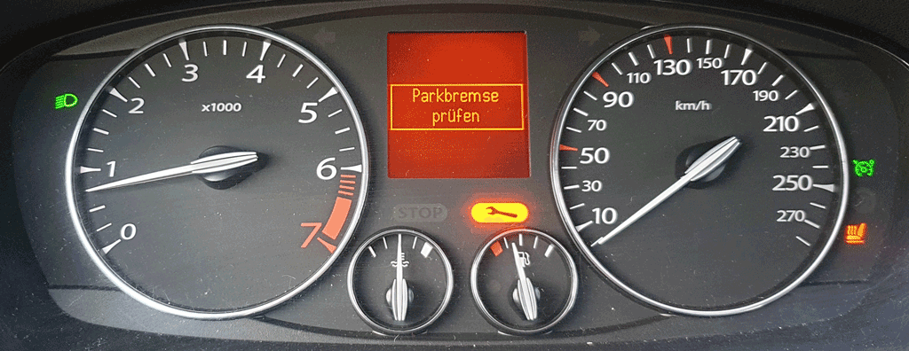 Nach Aussage der Verkäufer, musste das Steuerelement für elektrische Feststellbremse mit Zugseil getauscht werden, weil die Elektronik einen Schaden hatte und ein Seilzug gerissen war. Dies soll auch gemacht worden sein, aber nicht vom Renault Werkstatt, sondern von einem bekannten KFZ-Mechaniker.