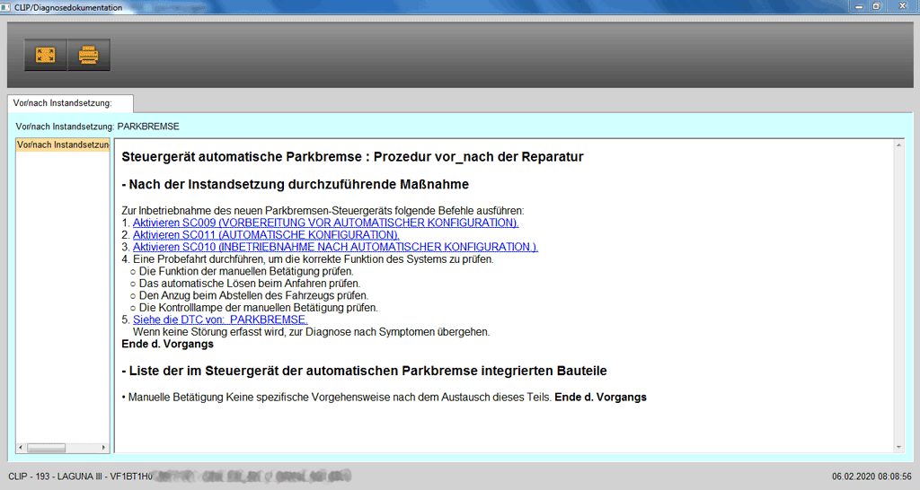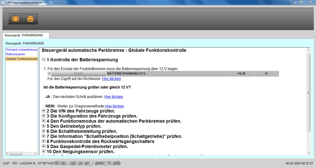 DIAGNOSEDOKUMENTATION – Vor/nach Instandsetzung: PARKBREMSE durchgeführt