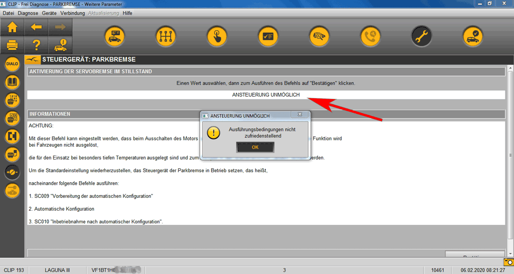 In CLIP-ReProgrammierung wird die Parkbremse nicht angezeigt