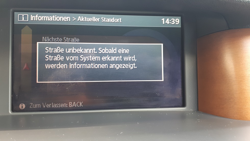 Allerdings wenn ich im Menü auf Info, aktueller Standort gehe, sagt mir das System: Straße unbekannt. Sobald eine Straße vom System erkannt wird, werden Informationen angezeigt.