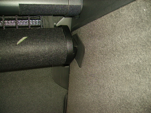 Das Netz wird mitsamt der Hülle, in der es aufgewickelt ist, doch einfach seitlich auf die Befestigungsschiene an der rechten (grösseren) "Hälfte" der Rücksitzlehne aufgeschoben und arretiert.