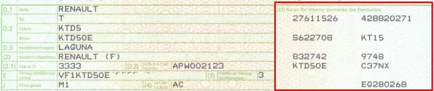 Ich habe jedoch aufgrund deines Hinweises in diesem Feld auf dem (entwerteten) "Teil II" des Ersteigentümers 9 verschiedene Buchstaben-/Zahlenkombinationen entdeckt (unter anderem "KTD0E", die auch Bestandteil der FIN und auch in "D2" eingetragen ist).