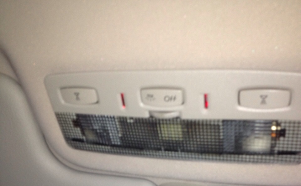 Hier mal ein Foto von den beiden Rot leuchtenden Streifen bei der vorderen Innenraumleuchte. Jemand ne Idee was die bedeuten? Manchmal an, manchmal aus und ich find keine LOgik dahinter.