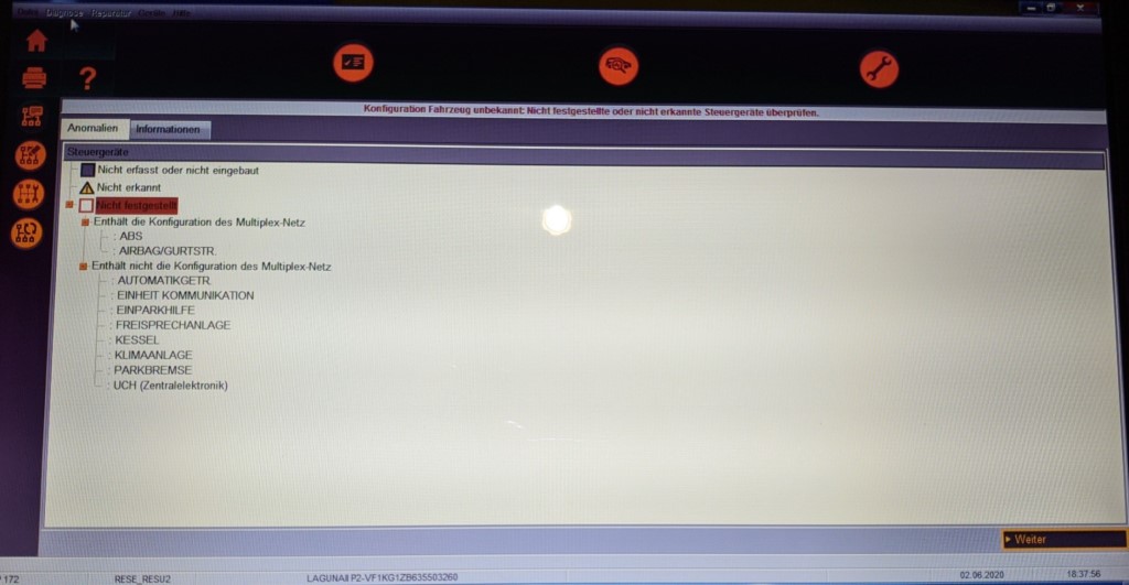 Die VIN wird zwar ohne Probleme ausgelesen aber beim Test des Multiplex Netzwerks kommt der Fehler "Konfiguration des Fahrzeugs unbekannt: