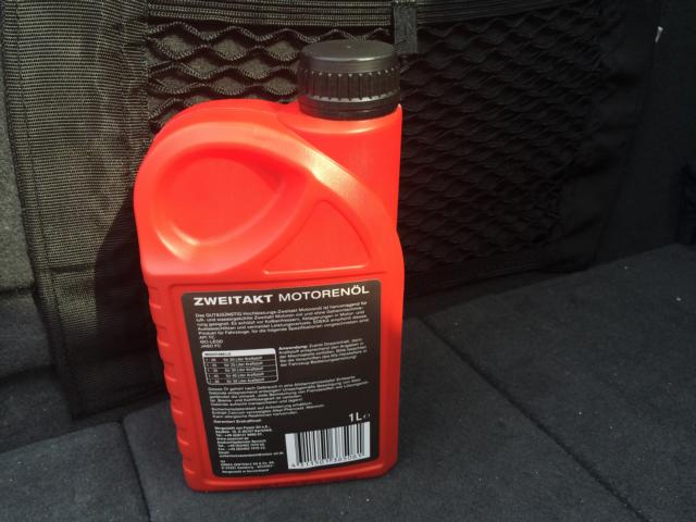 Ich schütte das Zweitakt-Öl kurz vor dem tanken in den Tank.