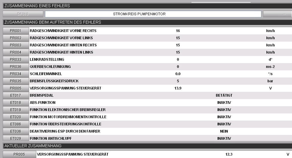 Öfters taucht der Fehler DF010 (Stromkreis Pumpenmotor) im ABS Steuergerät auf: